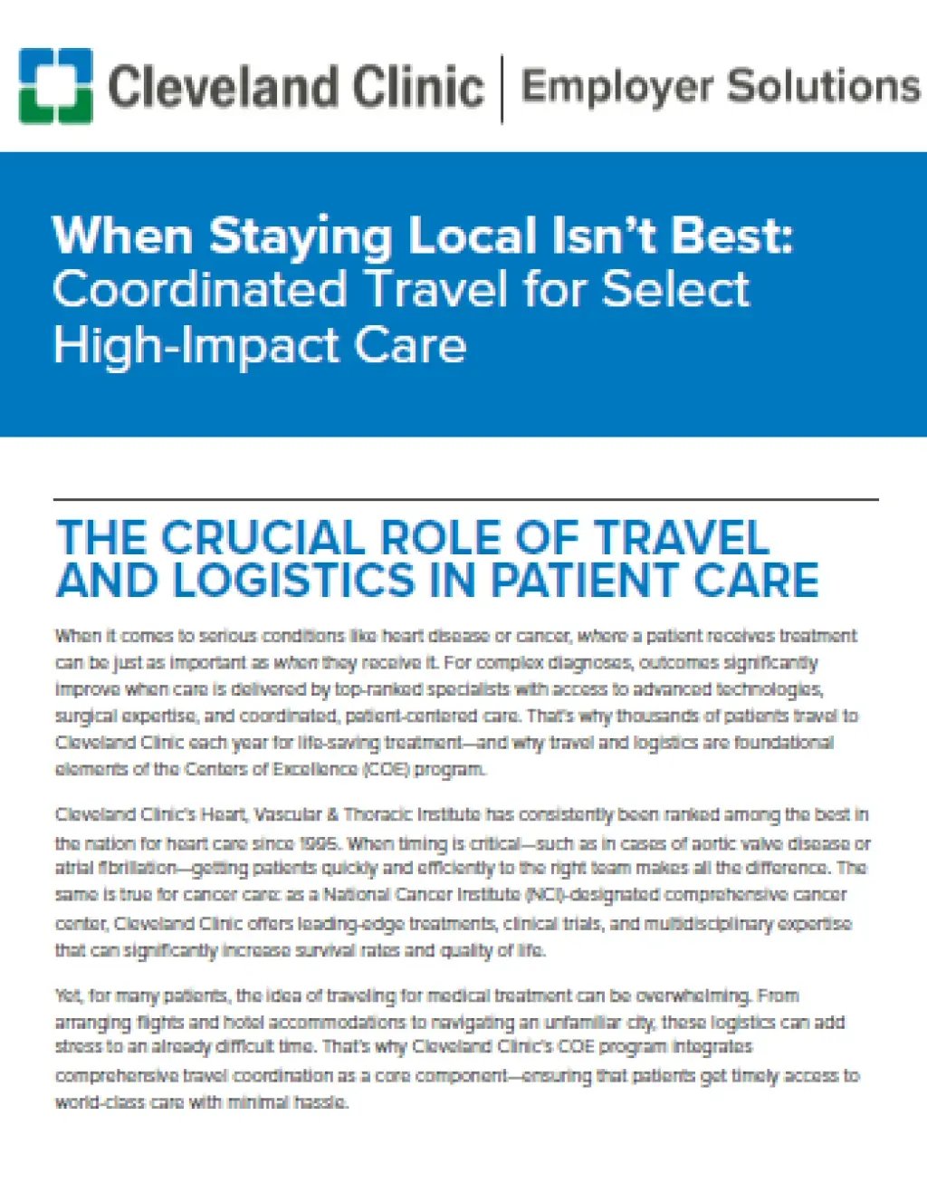 This white paper examines how Cleveland Clinic’s Centers of Excellence (COE) program integrates high-quality clinical expertise with comprehensive travel and logistical support to improve outcomes for patients. It explores how employers can provide access to top-ranked heart and cancer care, helping employees get the treatment they need while also reducing complications, improving recovery times, and managing healthcare costs effectively.